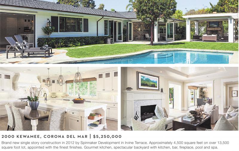 2000 KEWAMEE, CORONA DEL MAR | $5,250,000 Brand new single story construction in 2012 by Spinnaker Development in Irvine Terrace. Approximately 4,500 square feet on over 13,500 square foot lot, appointed with the finest finishes. Gourmet kitchen, spectacular backyard with kitchen, bar, fireplace, pool and spa.
