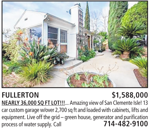 FULLERTON $1,588,000 NEARLY 36,000 SQ FT LOT!!!... AmazingviewofSan Clemente Isle!13 carcustomgaragew/over2,700 sq ft andloadedwithcabinets, liftsand equipment. Live offthe grid –green house, generator andpurification process of water supply.Call 714-482-9100