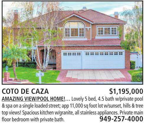 COTO DE CAZA $1,195,000 AMAZINGVIEW/POOLHOME!… Lovely 5bed,4.5 bath w/private pool &spa on asingle loaded street;app 11,000 sq footlot w/sunset,hills &tree topviews!Spaciouskitchen w/granite, all stainless appliances.Private main floorbedroom with privatebath. 949-257-4000