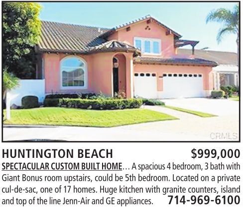 HUNTINGTON BEACH $999,000 SPECTACULARCUSTOMBUILTHOME… Aspacious4bedroom, 3bathwith Giant Bonus room upstairs, couldbe5th bedroom. Locatedonaprivate cul-de-sac, oneof17homes.Hugekitchen with granite counters, island andtop of thelineJenn-Air andGEappliances. 714-969-6100