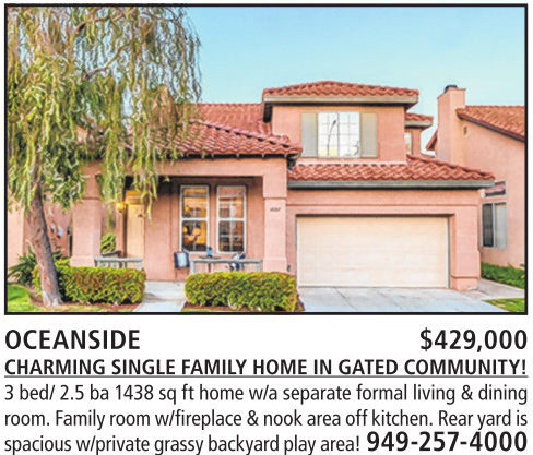 3bed/2.5 ba 1438 sq ft home w/aseparateformal living &dining room. Family room w/fireplace &nook area offkitchen. Rear yard is spacious w/privategrassy backyard play area! 949-257-4000
