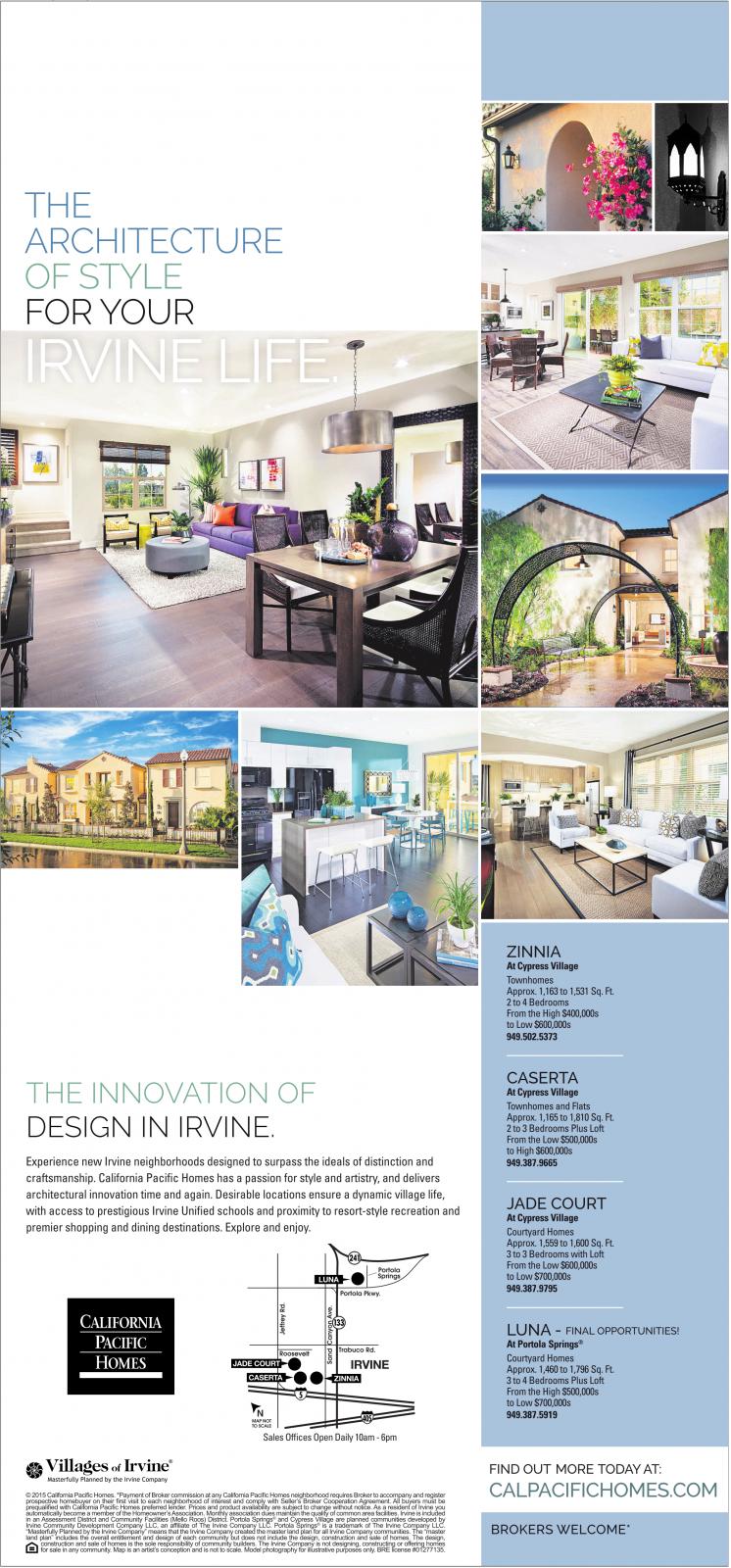 Experience new Irvine neighborhoods designed to surpass the ideals of distinction and craftsmanship. California Pacific Homes has a passion for style and artistry, and delivers architectural innovation time and again. Desirable locations ensure a dynamic village life, with access to prestigious Irvine Unified schools and proximity to resort-style recreation and premier shopping and dining destinations. Explore and enjoy.