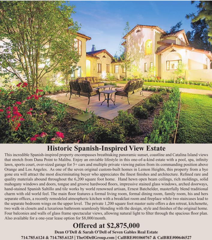 that stretch from Dana Point to Malibu. Enjoy an enviable lifestyle in this one-of-a-kind estate with a pool, spa, infinity lawn, sports court, over-sized garage for 5+ cars and multiple private viewing patios from its commanding position above Orange and Los Angeles. As one of the seven original custom-built homes in Lemon Heights, this property from a bye gone era will attract the most discriminating buyer who appreciates the finest finishes and architecture. Refined rare and