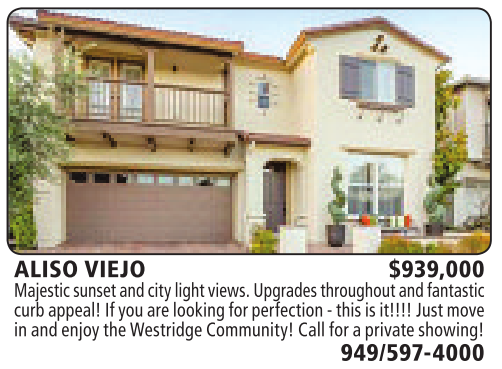 ALISO VIEJO $939,000 Majesticsunsetand citylight views. Upgrades throughout andfantastic curb appeal!Ifyou arelooking forperfection -this is it!!!! Just move in andenjoy theWestridge Community! Call for aprivate showing!