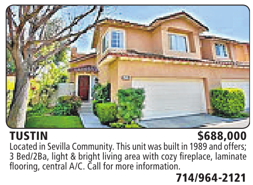 TUSTIN $688,000 Located in Sevilla Community. This unit wasbuilt in 1989 andoffers; 3Bed/2Ba, light &bright living area with cozy fireplace, laminate flooring,central A/C. Call for more information.