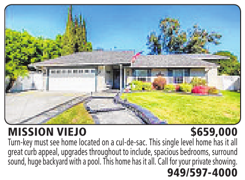 MISSION VIEJO $659,000 Turn-key must seehome locatedonacul-de-sac. This single level home hasitall great curb appeal,upgrades throughouttoinclude,spacious bedrooms,surround sound, huge backyard with apool. This home has it all. Call foryour private showing.