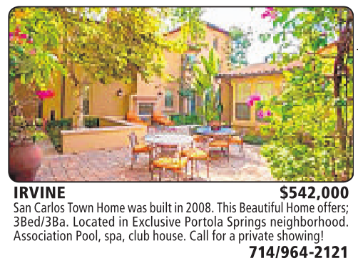 IRVINE $542,000 SanCarlos Town Home was built in 2008.This BeautifulHomeoffers; 3Bed/3Ba. Located in Exclusive Portola Springs neighborhood. AssociationPool, spa, club house. Call for aprivate showing!