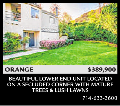 BEAUTIFUL LOWER END UNIT LOCATED ON A SECLUDED CORNER WITH MATURE TREES & LUSH LAWNS 714-633-3600