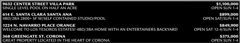 9632 CENTER STREET VILLA PARK $1,100,000 SINGLE LEVEL POOL ON HALF AN ACRE OPEN SUN 1-4 614 E. SANTA CLARA SANTA ANA $899,000 4BD/2BA 2800+ SF W/SELF CONTAINED STUDIO/POOL OPEN SAT/SUN 1-4 1224 N. NAVARRO PLACE ORANGE $849,900 WELCOME TO LOS TESOROS ESTATES! 4BD/3BA HOME WITH AN ENTERTAINERS BACKYARD OPEN SAT 12-4/SUN 1-4 368 GREENGATE ST. CORONA $375,000 GREAT PROPERTY LOCATED IN THE HEART OF CORONA OPEN SUN 1-4