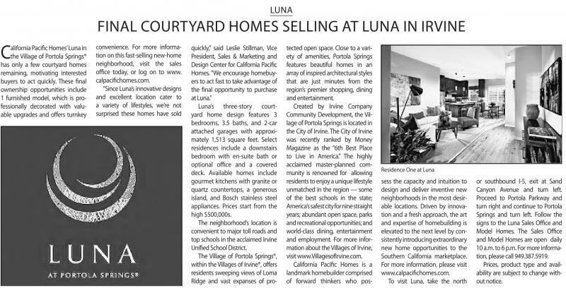 quickly,” said Leslie Stillman, Vice President, Sales & marketing and DesignCenterfor California Pacific Homes. “Weencourage homebuyers to actfast to take advantage of the final opportunity to purchase at Luna.”