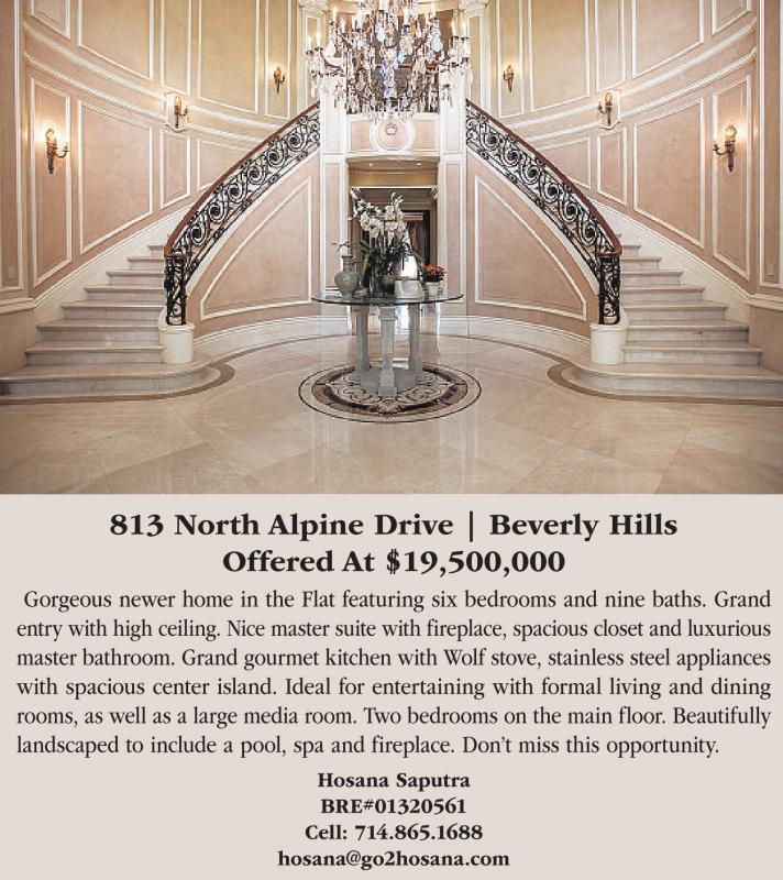813 North Alpine Drive | Beverly Hills Offered At $19,500,000 Gorgeous newer home in the Flat featuring six bedrooms and nine baths. Grand entry with high ceiling. Nice master suite with fireplace, spacious closet and luxurious master bathroom. Grand gourmet kitchen with Wolf stove, stainless steel appliances with spacious center island. Ideal for entertaining with formal living and dining rooms, as well as a large media room. Two bedrooms on the main floor. Beautifully landscaped to include a pool, spa and fireplace. Don’t miss this opportunity. Hosana Saputra BRE#01320561 Cell: 714.865.1688 hosana@go2hosana.com