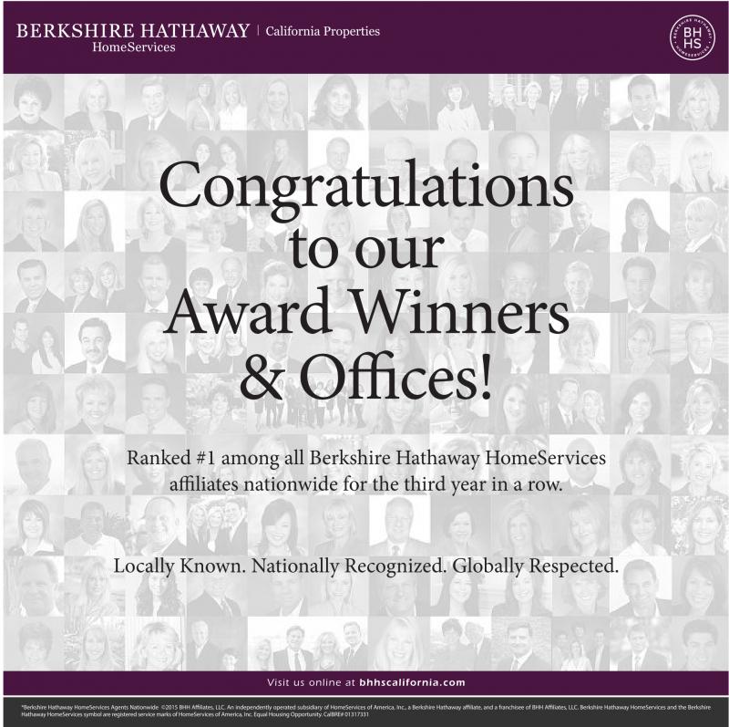 Congratulations to our Award Winners & Offices! Ranked #1 among all Berkshire Hathaway HomeServices affiliates nationwide for the third year in a row. Locally Known. Nationally Recognized. Globally Respected. Visit us online at bhhscalifornia.com *BerkshireHathawayHomeServicesAgents Nationwide ©2015 BHH Affiliates, LLC. An independently operated subsidiaryofHomeServicesofAmerica,Inc., aBerkshireHathawayaffiliate,and afranchisee of BHH Affiliates, LLC. BerkshireHathawayHomeServicesand the Berkshire HathawayHomeServices symbol areregistered servicemarks of HomeServices of America, Inc. EqualHousing Opportunity. CalBRE# 01317331