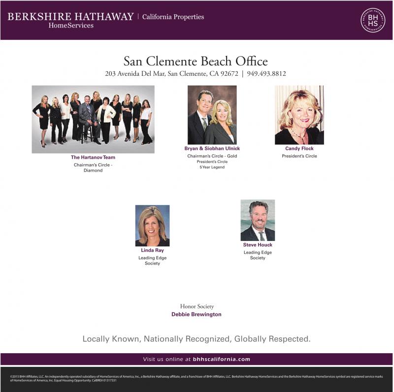 San Clemente Beach Office 203 Avenida Del Mar, San Clemente, CA 92672 | 949.493.8812 The HartanovTeam Chairman’s Circle - Diamond Bryan & Siobhan Ulnick Chairman’s Circle - Gold President’s Circle 5Year Legend Candy Flock President’s Circle Linda Ray Leading Edge Society Steve Houck Leading Edge Society Honor Society Debbie Brewington Locally Known, Nationally Recognized, Globally Respected. Visit us online at bhhscalifornia.com ©2015 BHH Affiliates,LLC.Anindependently operated subsidiaryofHomeServicesofAmerica, Inc.,aBerkshireHathawayaffiliate, andafranchisee of BHH Affiliates,LLC.BerkshireHathawayHomeServicesand the BerkshireHathawayHomeServicessymbolare registered servicemarks of HomeServices of America, Inc. EqualHousing Opportunity. CalBRE# 01317331