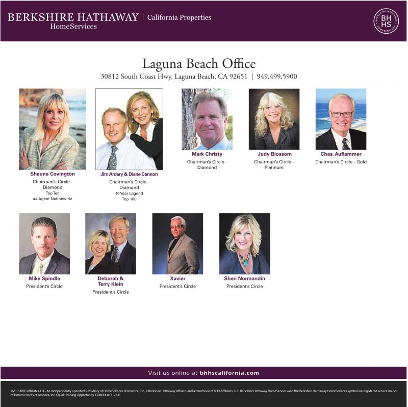 Laguna Beach Office 30812 South Coast Hwy, Laguna Beach, CA 92651 | 949.499.5900 Shauna Covington Chairman’s Circle - Diamond TopTen #4 Agent Nationwide JimArdery &Diane Cannon Chairman’s Circle - Diamond 10 Year Legend Top100 Mark Christy Chairman’s Circle - Diamond Judy Blossom Chairman’s Circle - Platinum Chas. Auflammer Chairman’s Circle - Gold Mike Spindle President’s Circle Deborah & Terry Klein President’s Circle Xavier President’s Circle Sheri Normandin President’s Circle Visit us online at bhhscalifornia.com ©2015 BHH Affiliates,LLC.Anindependently operated subsidiaryofHomeServices of America, Inc.,aBerkshireHathawayaffiliate, andafranchisee of BHH Affiliates,LLC.BerkshireHathawayHomeServicesand the BerkshireHathawayHomeServicessymbolare registered servicemarks of HomeServices of America, Inc. EqualHousing Opportunity. CalBRE# 01317331 See also
