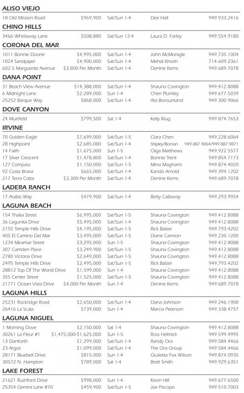 ALISO VIEJO 18 Old Mission Road $969,900 Sat/Sun 1-4 Dee Hall 949.933.2416 CHINO HILLS 3466 Whirlaway Lane $508,880 Sat/Sun 12-4 Laura D. Farley 949.554.9180 CORONA DEL MAR 1011 Bonnie Doone $4,995,000 Sat/Sun 1-4 John McMonigle 949.735.1004 1024 Sandpiper $4,900,000 Sat/Sun 1-4 Mehdi Khosh 714.609.2361 602.5 Marguerite Avenue $3,800 Per Month Sat/Sun 1-4 Denine Kerns 949.689.7078 DANA POINT 31 Beach View Avenue $14,388,000 Sat/Sun 1-4 Shauna Covington 949.412.8088 6Midnight Lane $2,289,000 Sun 1-4 Cheri Plumley 949.677.5039 25252 Barque Way $868,000 Sat/Sun 1-4 Ata Boroumand 949.300.9066 DOVE CANYON 24 Muirfield $799,500 Sat 1-4 Kelly Klug 949.874.7653 IRVINE 70 Golden Eagle $7,699,000 Sat/Sun 1-5 Clara Chen 949.228.6064 28 Highpoint $2,685,000 Sat/Sun 1-4 Shipley/Boman 949.887.9064/949.887.9871 14 Faith $1,675,000 Sun 1-5 Olga Matthews 949.922.5577 17 Silver Crescent $1,478,800 Sat/Sun 1-4 Bonnie Trent 949.854.7173 127 Compass $1,150,000 Sat/Sun 1-5 Mina Maghami 949.874.4020 92 Costa Brava $665,000 Sat/Sun 1-4 Kandis Arnold 949.394.1202 217 Terra Cotta $3,300 Per Month Sat/Sun 1-4 Denine Kerns 949.689.7078 LADERA RANCH 17 Arabis Way $479,900 Sat/Sun 1-4 Betty Callaway 949.293.9954 LAGUNA BEACH 154 Thalia Street $6,995,000 Sat/Sun 1-5 Shauna Covington 949.412.8088 36 Lagunita Drive $5,495,000 Sat/Sun 1-4 Shauna Covington 949.412.8088 2155 Temple Hills Drive $4,195,000 Sat/Sun 1-5 Rick Balzer 949.793.4202 405 El Camino Del Mar $3,495,000 Sat/Sun 1-5 Diane Cannon 949.230.1200 1234 Miramar Street $3,295,000 Sun 1-5 Shauna Covington 949.412.8088 307 Camden Place $3,249,900 Sat/Sun 1-5 Shauna Covington 949.412.8088 2780 Victoria Drive $2,649,000 Sat/Sun 1-5 Shauna Covington 949.412.8088 2495 Temple Hills Drive $2,495,000 Sat/Sun 1-5 Rick Balzer 949.793.4202 28812 TopOfThe World Drive $1,599,000 Sun 1-4 Shauna Covington 949.412.8088 355 Center Street $1,525,000 Sat/Sun 1-5 Shauna Covington 949.412.8088 21771 Ocean Vista Drive $4,000 Per Month Sun 1-4 Denine Kerns 949.689.7078 LAGUNA HILLS 25231 Rockridge Road $2,650,000 Sat/Sun 1-4 Dana Johnson 949.246.1900 26416 La Scala $739,000 Sun 1-4 Marcia Peterson 949.338.4757 LAGUNA NIGUEL 1Morning Dove $2,150,000 Sat 1-4 Shauna Covington 949.412.8088 30261 La Fleur #1 $1,475,000-$1,625,000 Sun 1-5 Ross Helmick 949.599.4995 13 Danforth $1,299,000 Sat/Sun 1-4 Randy Ora 949.584.4466 23 Argos $1,099,000 Sat/Sun 1-4 The Ora Group 949.584.4466 28171 Bluebell Drive $815,000 Sun 1-4 Giulietta Fox Wilson 949.874.0935 30572 N. Hampton $789,000 Sat 1-4 Brett Smith 949.929.6351 LAKE FOREST 21621 Rushford Drive $998,000 Sun 1-4 Kevin Hill 949.677.6500 25354 Gemini Lane #70 $459,900 Sat/Sun 1-5 Joe Piscopo 949.510.7003