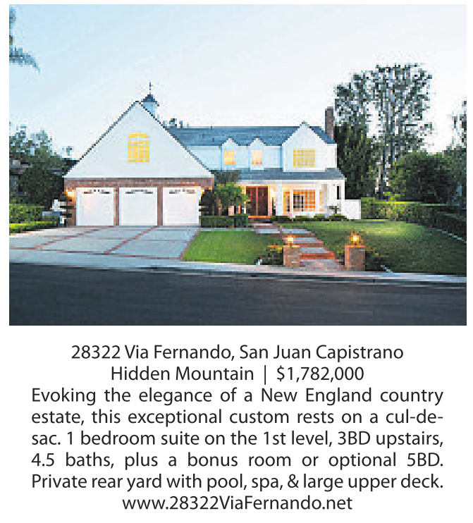 28322 Via Fernando, San Juan Capistrano Hidden Mountain | $1,782,000 Evoking the elegance of a New England country estate, this exceptional custom rests on a cul-desac. 1 bedroom suite on the 1st level, 3BD upstairs, 4.5 baths, plus a bonus room or optional 5BD. Privaterear yard with pool,spa, &large upper deck. www.28322ViaFernando.net