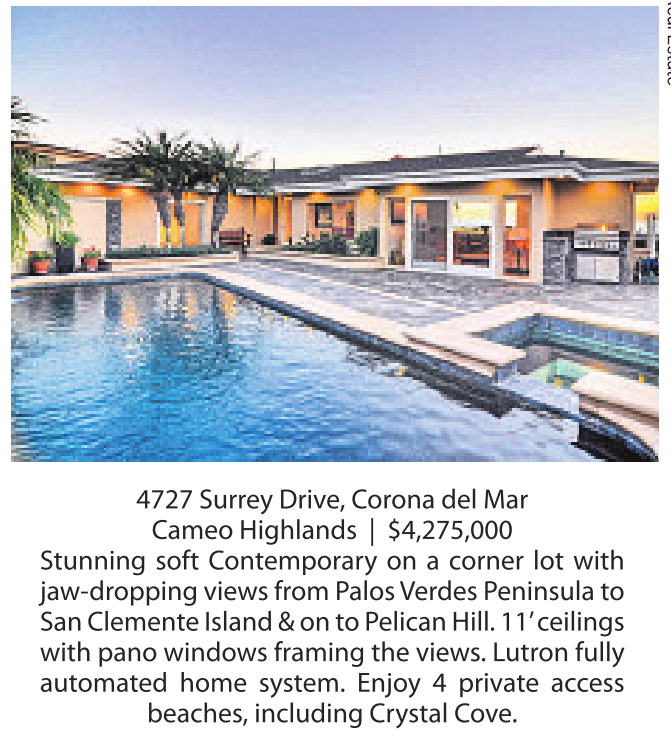 4727 Surrey Drive, Corona del Mar Cameo Highlands | $4,275,000 Stunning soft Contemporary on a corner lot with jaw-dropping viewsfromPalos Verdes Peninsula to San ClementeIsland &ontoPelican Hill.11’ceilings with pano windows framing the views. Lutron fully automated home system. Enjoy 4 private access beaches, including Crystal Cove.