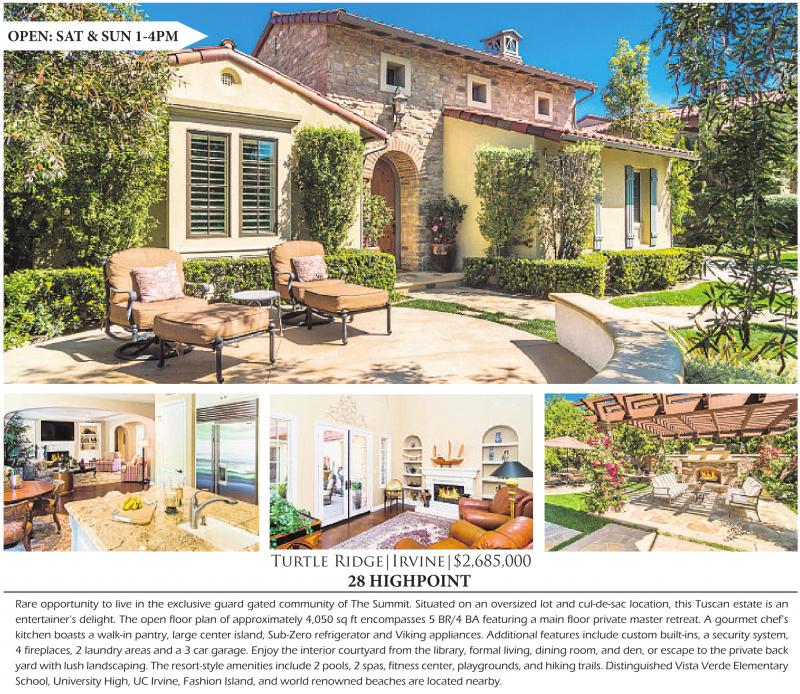 OPEN: SAT & SUN 1-4PM Turtle Ridge|Irvine|$2,685,000 28 HIGHPOINT Rare opportunity to live in the exclusive guard gated community of The Summit. Situated on an oversized lot and cul-de-sac location, this Tuscan estate is an entertainer’s delight. The open floor plan of approximately 4,050 sq ft encompasses 5 BR/4 BA featuring a main floor private master retreat. A gourmet chef’s kitchen boasts a walk-in pantry, large center island, Sub-Zero refrigerator and Viking appliances. Additional features include custom built-ins, a security system, 4 fireplaces, 2 laundry areas and a 3 car garage. Enjoy the interior courtyard from the library, formal living, dining room, and den, or escape to the private back yard with lush landscaping. The resort-style amenities include 2 pools, 2 spas, fitness center, playgrounds, and hiking trails. Distinguished Vista Verde Elementary School, University High, UC Irvine, Fashion Island, and world renowned beaches are located nearby. See also