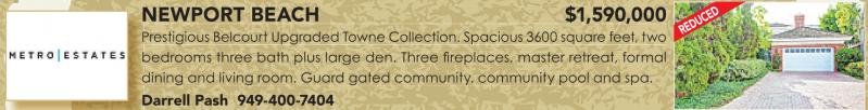NEWPORT BEACH $1,590,000 Prestigious Belcourt Upgraded Towne Collection. Spacious 3600 square feet, two bedrooms three bath plus large den. Three fireplaces, master retreat, formal dining and living room. Guard gated community. community pool and spa. d Darrell Pash 949-400-7404 D