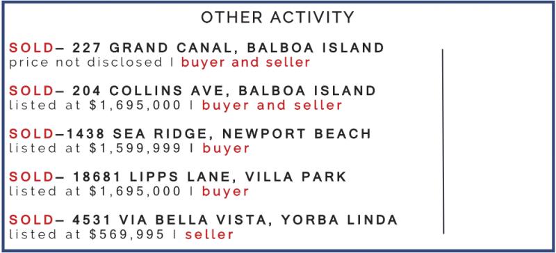 O T H E R A C T I V I T Y S O L D — 2 2 7 G R A N D C A N A L , B A L B O A I S L A N D price not disclosed I buyer and seller S O LD — 204 COLLI NS AV E, BA LB OA IS LA ND l is t ed a t $1, 6 95,000 I buyer and se ller S O LD — 143 8 SEA RIDGE, NEW PO RT BEA CH l is ted a t $1, 5 99,999 I buyer S O LD — 186 81 LIPPS LA NE, VI LLA PA RK l is t ed a t $1, 6 95,000 I buyer S O LD — 453 1 VI A BE LLA VIS TA, YO RBA LI NDA l is ted a t $569, 995 I seller