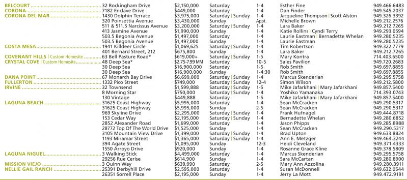 BELCOURT ................................................. 32 Rockingham Drive $2,150,000 Saturday 1-4 Esther Fine 949.466.6483 CORONA.................................................... 7182 Enclave Drive $449,000 Saturday 1-4 Dan Finder 949.545.2037 CORONA DEL MAR.................................... 1430 Dolphin Terrace $3,975,000 Saturday | Sunday 1-4 JacquelineThompson | ScottAlston 949.326.3392 320 Poinsettia Avenue $3,430,000 Sunday Appt. Michelle Brown 949.212.2576 511 & 511.5 Narcissus Avenue $3,200,000 Saturday | Sunday 1-4 Lara Baker 949.212.7265 413 Jasmine Avenue $1,990,000 Sunday 1-4 Katie Rollins | Cyndi Terry 949.293.0594 503.5 Begonia Avenue $1,497,000 Saturday 1-4 Laurie Eastman | Bernadette Whelan 949.280.5235 503.5 Begonia Avenue $1,497,000 Sunday 1-4 Laurie Eastman 949.280.5235 COSTA MESA............................................. 1941 Killdeer Circle $1,069,625 Saturday | Sunday 1-4 Tim Robertson 949.322.7779 401 Bernard Street, 212 $675,800 Sunday 1-4 Lara Baker 949.212.7265 COVENANT HILLS | Custom Homesite ............ 63 Bell Pasture Road* $619,000+ Saturday | Sunday 1-5 Mary Kontra 714.403.6500 CRYSTAL COVE | Custom Homesite...................48 Deep Sea* $2.75-7.99 MM Saturday 10-5 Sales Pavilion 949.720.2683 30 Deep Sea $16,900,000 Saturday 1-5 Rob Smith 949.697.8855 30 Deep Sea $16,900,000 Sunday 1-4:30 Rob Smith 949.697.8855 DANA POINT............................................. 67 Monarch Bay Drive $6,699,000 Saturday | Sunday 1-4 Marcus Skenderian 949.295.5758 FULLERTON ............................................... 1332 Pico Street $749,000 Saturday | Sunday 12-4 Simon Wilson 949.212.5800 IRVINE ....................................................... 32 Townsend $1,599,888 Saturday | Sunday 1-5 Mike Jafarkhani | Mary Jafarkhani 949.857.5400 8 Morning Star $750,000 Saturday | Sunday 1-4 Yoshiko Yamanaka 714.393.0743 130 Vintage $449,888 Saturday 1-5 Mike Jafarkhani | Mary Jafarkhani 949.857.5400 LAGUNA BEACH........................................ 31625 Coast Highway $5,995,000 Saturday 1-4 Sean McCracken 949.290.5317 31625 Coast Highway $5,995,000 Sunday 2-5 Sean McCracken 949.290.5317 969 Skyline Drive $2,295,000 Saturday | Sunday 1-4 Frank Hufnagel 949.444.8718 153 Cedar Way $2,195,000 Saturday | Sunday 1-4 Bernadette Whelan 949.280.6852 2852 Alexander Road $1,699,000 Saturday 1-4 Jason Phipps 949.285.8988 28772 Top Of The World Drive $1,525,000 Sunday 1-4 Sean McCracken 949.290.5317 3105 Mountain View Drive $1,399,000 Saturday | Sunday 1-4 Brad Upton 949.633.8824 1193 Miramar Street $1,365,000 Saturday | Sunday 1-4 Ann E. Metzger 949.464.3244 394 Agate Street $1,095,000 Sunday 12-3 Heidi Cleveland 949.371.4333 1550 Arroyo Drive $920,000 Sunday 1-4 Rosanne Grace Kline 949.378.5809 LAGUNA NIGUEL....................................... 3 Walking Stick $4,499,000 Saturday 1-4 Marcus Skenderian 949.295.5758 29256 Rue Cerise $614,900 Sunday 1-4 Sara McCartan 949.280.8900 MISSION VIEJO ......................................... 3 Quinn Way $639,990 Saturday 2-5 Mary Ann Azzolina 949.280.3911 NELLIE GAIL RANCH ................................. 25391 Derbyhill Drive $2,595,000 Saturday 1-4 Susan McDonnell 949.632.0544 26351 Sorrell Place $2,195,000 Sunday 1-4 Jerry La Mott 949.472.9191