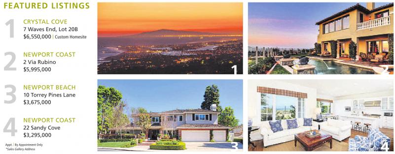 FEATURED LISTINGS 1 CRYSTAL COVE 7 Waves End, Lot 20B $6,550,000 | Custom Homesite 2 NEWPORT COAST 2 Via Rubino $5,995,000 3 NEWPORT BEACH 10 Torrey Pines Lane $3,675,000 4 NEWPORT COAST 22 Sandy Cove $3,295,000 Appt. | By AppointmentOnly *SalesGallery Address See also
