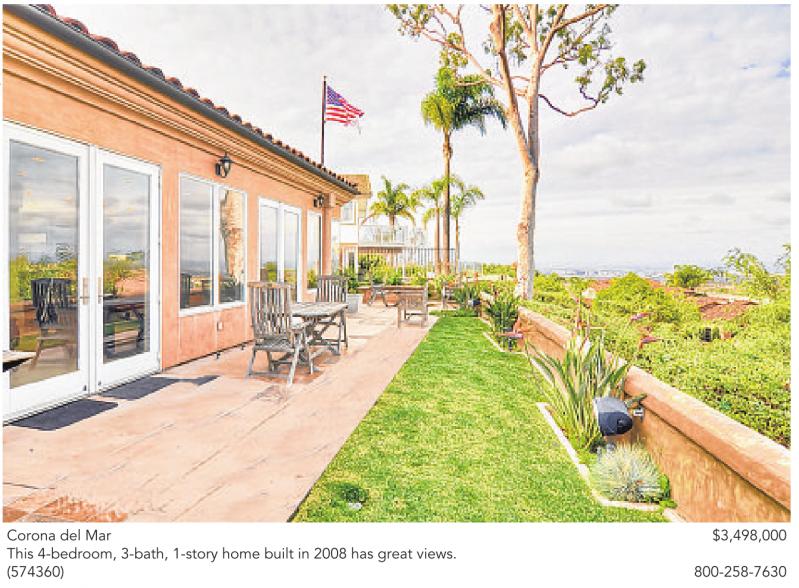 Corona del Mar $3,498,000 This 4-bedroom, 3-bath, 1-story home built in 2008 has great views. (574360) 800-258-7630