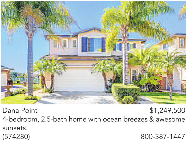 Dana Point $1,249,500 4-bedroom, 2.5-bath home with ocean breezes & awesome sunsets. (574280) 800-387-1447