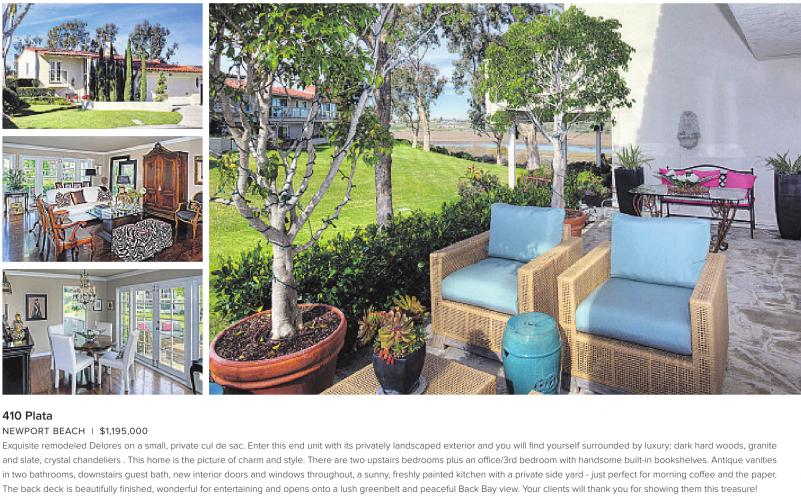 NEWPORT BEACH | $1,195,000 Exquisite remodeled Delores on a small, private cul de sac. Enter this end unit with its privately landscaped exterior and you will find yourself surrounded by luxury: dark hard woods, granite and slate, crystal chandeliers . This home is the picture of charm and style. There are two upstairs bedrooms plus an office/3rd bedroom with handsome built-in bookshelves. Antique vanities in two bathrooms, downstairs guest bath, new interior doors and windows throughout, a sunny, freshly painted kitchen with a private side yard - just perfect for morning coffee and the paper. The back deck is beautifully finished, wonderful for entertaining and opens onto a lush greenbelt and peaceful Back Bay view. Your clients will thank you for showing them this treasure!