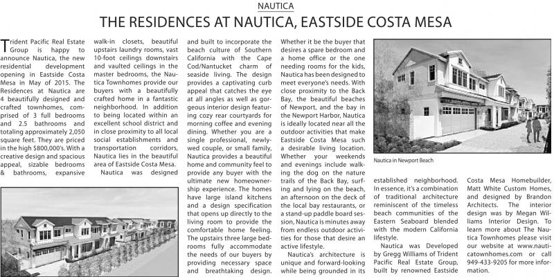 Pacific Real estate group is happy to announce nautica, the new residential development opening in eastside Costa mesa in may of 2015. The Residences at nautica are 4 beautifully designed and crafted townhomes, comprised of 3 full bedrooms and 2.5 bathrooms and totaling approximately 2,050 square feet. They are priced in the high $800,000’s. With a creative design and spacious appeal, sizable bedrooms & bathrooms, expansive