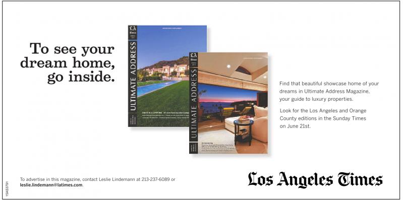 To see your dream home, go inside. Find that beautiful showcase home of your dreams in Ultimate Address Magazine, your guide to luxury properties. Look for the Los Angeles and Orange County editions in the Sunday Times on June 21st. To advertise in this magazine, contact Leslie Lindemann at 213-237-6089 or leslie.lindemann@latimes.com.