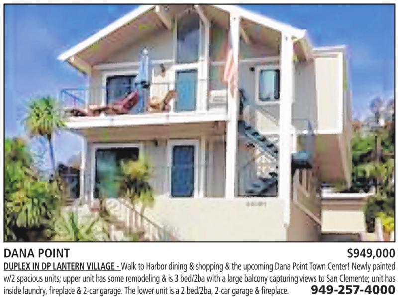 DANA POINT $949,000 DUPLEX IN DP LANTERN VILLAGE - Walk to Harbordining&shopping&the upcomingDana Point Town Center!Newly painted w/2spacious units; upperunithas someremodeling &is3bed/2ba with alarge balcony capturingviews to SanClemente;unithas inside laundry, fireplace &2-car garage. Thelower unit is a2bed/2ba,2-car garage&fireplace. 949-257-4000