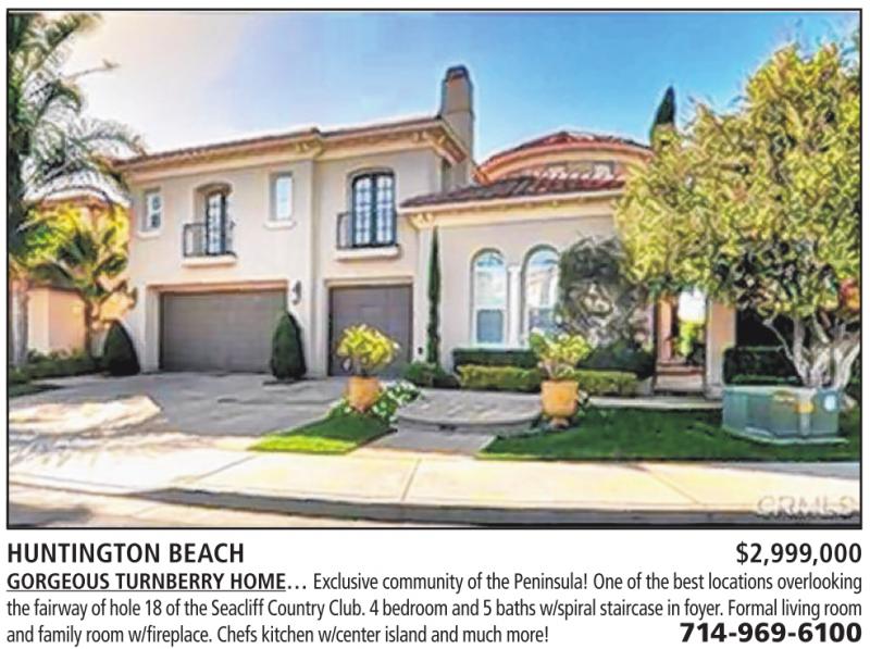 HUNTINGTON BEACH $2,999,000 GORGEOUS TURNBERRY HOME… Exclusive communityofthe Peninsula!One of thebestlocations overlooking thefairway of hole 18 of theSeacliff CountryClub. 4bedroomand 5baths w/spiralstaircaseinfoyer. Formal living room andfamilyroomw/fireplace. Chefskitchen w/center island andmuch more! 714-969-6100