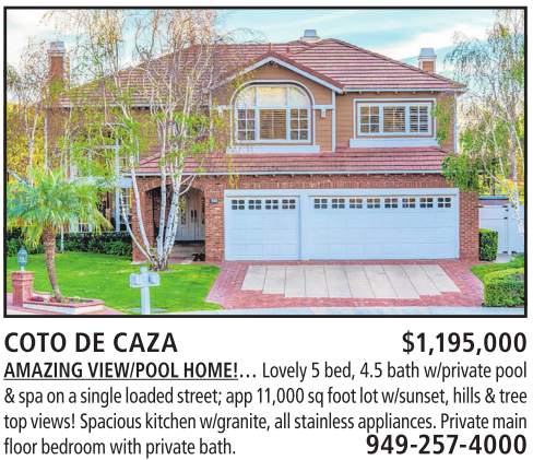 COTO DE CAZA $1,195,000 AMAZINGVIEW/POOLHOME!… Lovely 5bed, 4.5bathw/private pool &spa on asingle loaded street;app 11,000 sq footlot w/sunset,hills &tree topviews!Spaciouskitchen w/granite, all stainless appliances.Private main floorbedroom with privatebath. 949-257-4000