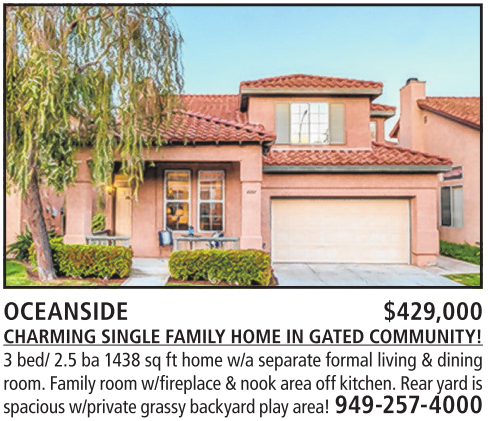3bed/2.5 ba 1438 sq ft home w/aseparateformal living &dining room. Family room w/fireplace &nook area offkitchen. Rear yard is spacious w/privategrassy backyard play area! 949-257-4000
