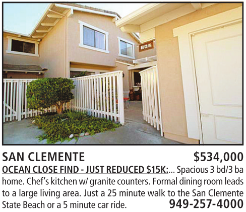 home. Chef’s kitchenw/granitecounters. Formal dining room leads to alarge living area. Just a25minute walk to theSan Clemente StateBeachora5minute carride. 949-257-4000