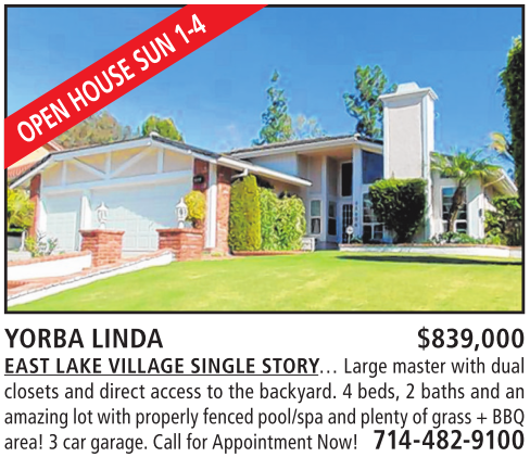 closets and direct access to the backyard. 4beds, 2baths and an YORBA LINDA $839,000 EAST LAKE VILLAGE SINGLE STORY… Large master with dual amazinglot with properly fencedpool/spa andplentyofgrass+BBQ area!3car garage. Call forAppointmentNow! 714-482-9100