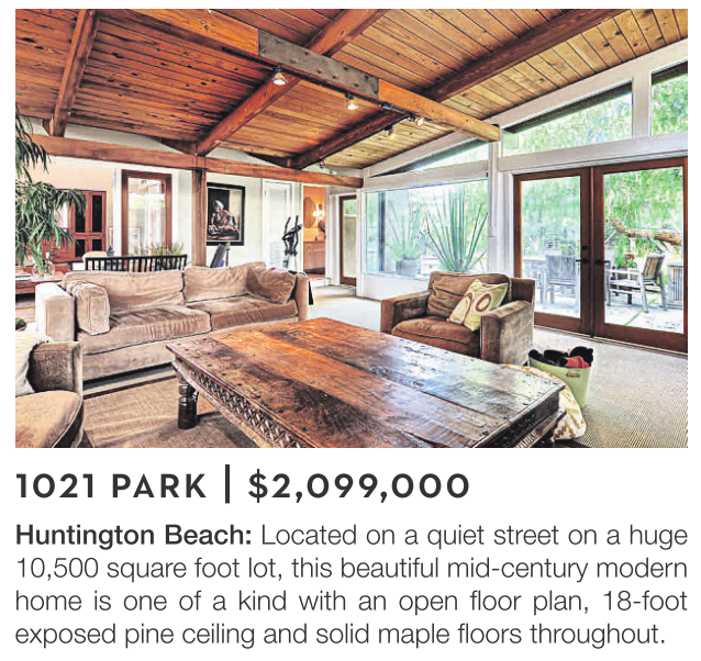 Huntington Beach: Located on a quiet street on a huge 10,500 square foot lot, this beautiful mid-century modern home is one of a kind with an open floor plan, 18-foot exposed pine ceiling and solid maple floors throughout.