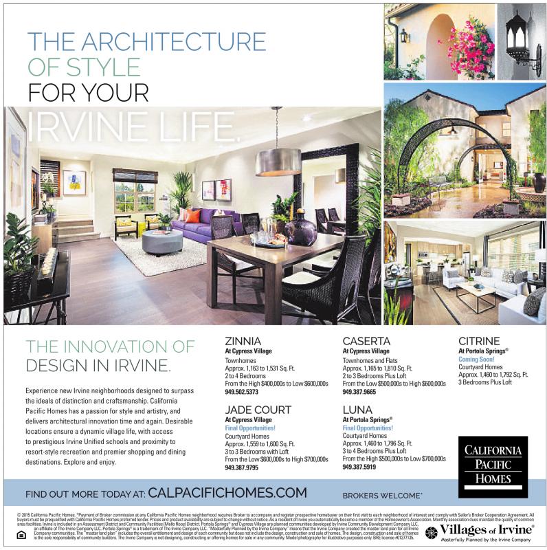 ©2015California Pacific Homes. *Payment of Broker commission at any California Pacific Homes neighborhood requires Broker to accompany and register prospective homebuyer on their first visit to each neighborhood of interest and comply with Seller’sBrokerCooperation Agreement. All buyers must be prequalified with California Pacific Homes preferred lender.Pricesand product availability are subject to change without notice. As aresident of Irvine you automatically become amember of the Homeowner’sAssociation. Monthly association dues maintain the quality of common area facilities. Irvine is included in an Assessment District and Community Facilities (Mello Roos) District. Portola Springs ® and Cypress Village are planned communities developed by Irvine Community Development Company LLC, an affiliate of The Irvine Company LLC. Portola Springs ® is atrademark of The Irvine Company LLC. “Masterfully Planned by the Irvine Company” means that the Irvine Company created the master land plan for all Irvine Company communities. The “master land plan” includes the overall entitlement and design of each community but does not include the design, construction and sale of homes. The design, construction and sale of homes is the sole responsibility of community builders. The Irvine Company is not designing, constructing or offering homes for sale in any community.Model photography for illustrative purposes only.BRE license#01277135.