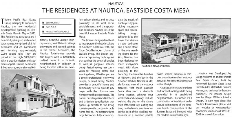 nautica was Developed by gregg Williams of Trident Pacific Real estate group, built by renowned eastside Costa mesa Homebuilder,mattWhiteCustom Homes,and designed by Brandon architects. The interior design was by megan Williams Interior Design. To learn more about The nautica Townhomes please visit our website at www.nauticatownhomes.com or call 949-433- 9205 formoreinformation.