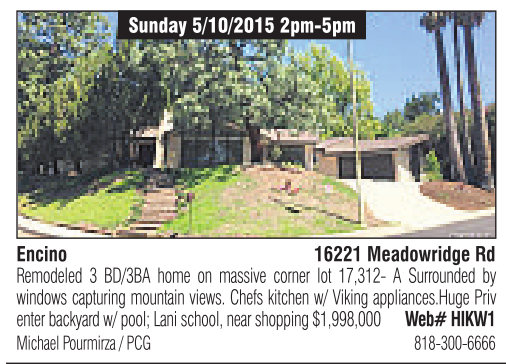 Encino Sunday 5/10/2015 2pm-5pm 16221 Meadowridge Rd Michael Pourmirza /PCG 818-300-6666 Remodeled 3 BD/3BA home on massive corner lot 17,312- A Surrounded by windows capturing mountain views. Chefs kitchen w/ Viking appliances.Huge Priv enterbackyardw/pool; Lani school, nearshopping $1,998,000 Web# HIKW1