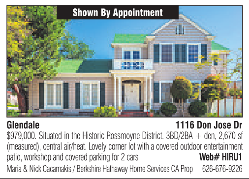 Glendale Shown By Appointment 1116 Don Jose Dr Maria &Nick Cacarnakis /BerkshireHathawayHomeServicesCAProp 626-676-9226 $979,000. Situated in the Historic Rossmoyne District. 3BD/2BA +den, 2,670 sf (measured), centralair/heat.Lovely cornerlot withacovered outdoorentertainment patio,workshop andcovered parking for2cars Web# HIRU1