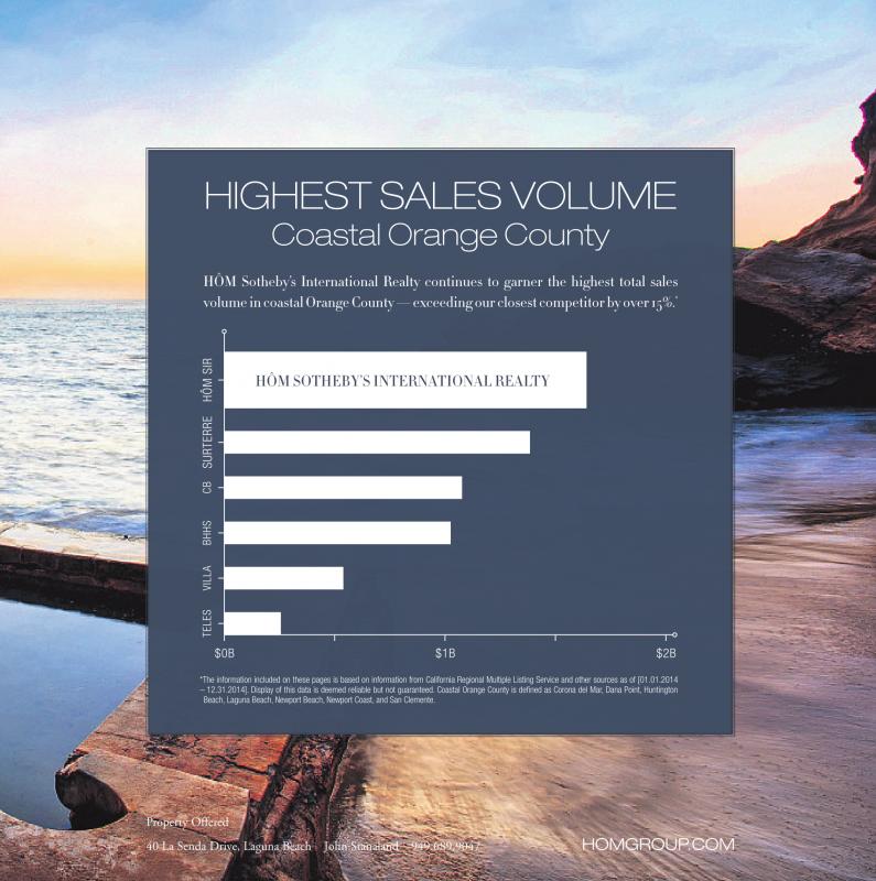 HÔM Sotheby’s International Realty continues to garner the highest total sales volume in coastal Orange County —exceeding our closest competitor by over 15%. *
