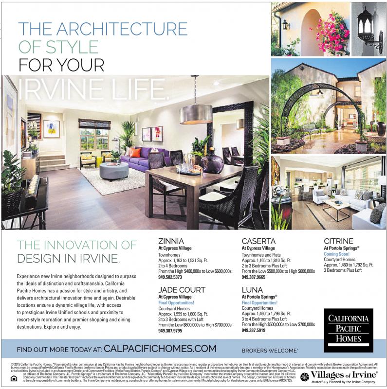 ©2015California Pacific Homes. *Payment of Broker commission at any California Pacific Homes neighborhood requires Broker to accompany and register prospective homebuyer on their first visit to each neighborhood of interest and comply with Seller’sBrokerCooperation Agreement. All buyers must be prequalified with California Pacific Homes preferred lender.Pricesand product availability are subject to change without notice. As aresident of Irvine you automatically become amember of the Homeowner’sAssociation. Monthly association dues maintain the quality of common area facilities. Irvine is included in an Assessment District and Community Facilities (Mello Roos) District. Portola Springs ® and Cypress Village are planned communities developed by Irvine Community Development Company LLC, an affiliate of The Irvine Company LLC. Portola Springs ® is atrademark of The Irvine Company LLC. “Masterfully Planned by the Irvine Company” means that the Irvine Company created the master land plan for all Irvine Company communities. The “master land plan” includes the overall entitlement and design of each community but does not include the design, construction and sale of homes. The design, construction and sale of homes is the sole responsibility of community builders. The Irvine Company is not designing, constructing or offering homes for sale in any community.Model photography for illustrative purposes only.BRE license #01277135.