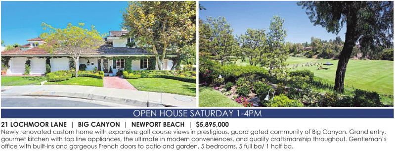 OPEN HOUSE SATURDAY 1-4PM 21 LOCHMOOR LANE | BIG CANYON | NEWPORT BEACH | $5,895,000 Newly renovated custom home with expansive golf course views in prestigious, guard gated community of Big Canyon. Grand entry, gourmet kitchen with top line appliances, the ultimate in modern conveniences, and quality craftsmanship throughout. Gentleman’s See also