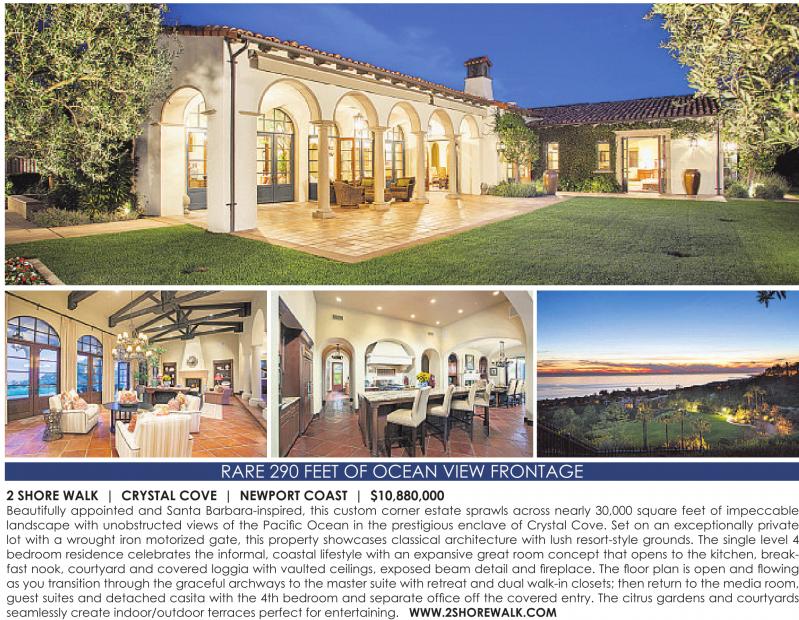 2 SHORE WALK | CRYSTAL COVE | NEWPORT COAST | $10,880,000 lot with a wrought iron motorized gate, this property showcases classical architecture with lush resort-style grounds. The single level 4 - as you transition through the graceful archways to the master suite with retreat and dual walk-in closets; then return to the media room, WWW.2SHOREWALK.COM