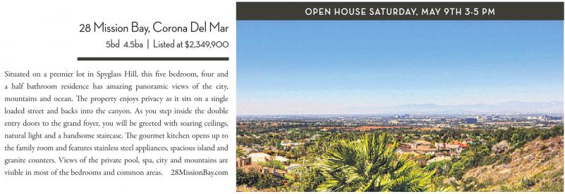 28 Mission Bay, Corona Del Mar 5bd 4.5ba | Listed at $2,349,900 OPEN HOUSE SATURDAY, MAY 9TH 3-5 PM Situated on a premier lot in Spyglass Hill, this five bedroom, four and a half bathroom residence has amazing panoramic views of the city, mountains and ocean. The property enjoys privacy as it sits on a single loaded street and backs into the canyon. As you step inside the double entry doors to the grand foyer, you will be greeted with soaring ceilings, natural light and a handsome staircase. The gourmet kitchen opens up to the family room and features stainless steel appliances, spacious island and granite counters. Views of the private pool, spa, city and mountains are visible in most of the bedrooms and common areas. 28MissionBay.com
