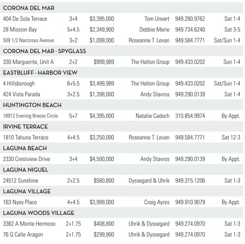 CORONA DEL MAR 404 De Sola Terrace 3+4 $3,395,000 TomUnvert 949.280.9762 Sat 1-4 28 Mission Bay 5+4.5 $2,349,900 Debbie Marie 949.734.6240 Sat 3-5 509 1/2 Narcissus Avenue 3+2 $1,099,000 Roseanne T. Levan 949.584.7771 Sat/Sun 1-4 CORONA DEL MAR -SPYG SS 330 Marguerite, Unit A 2+2 $999,989 The Halton Group 949.433.0202 Sun 1-4 EASTBLUFF -HARBOR VIEW 4Hillsborough 6+5.5 $3,499,989 The Halton Group 949.433.0202 Sat/Sun 1-4 424 VistaParada 3+2.5 $1,398,000 Andy Stavros 949.290.0139 Sat 1-4 HUNTINGTONBEACH 18912 Evening Breeze Circle 5+7 $4,395,000 Natalie Cadoch 310.854.9974 By Appt. IRVINE TERRACE 1810 Tahuna Terrace 4+4.5 $3,250,000 Roseanne T. Levan 949.584.7771 Sat 12-3 GUNA BEACH 2330 Crestview Drive 3+4 $4,500,000 Andy Stavros 949.290.0139 By Appt. GUNA NIGUEL 24512 Sunshine 2+2.5 $580,800 Dyssegard &Uhrik 949.315.1206 Sat 1-3 GUNA VIL GE 163 Nyes Place 4+4.5 $3,999,000 Craig Ayres 949.910.9079 By Appt. GUNA WOODSVIL GE 3362 AMonte Hermoso 2+1.75 $408,800 Uhrik &Dyssegard 949.274.0970 Sat 1-3 76 QCalle Aragon 2+1.75 $299,900 Uhrik &Dyssegard 949.274.0970 Sat 1-3