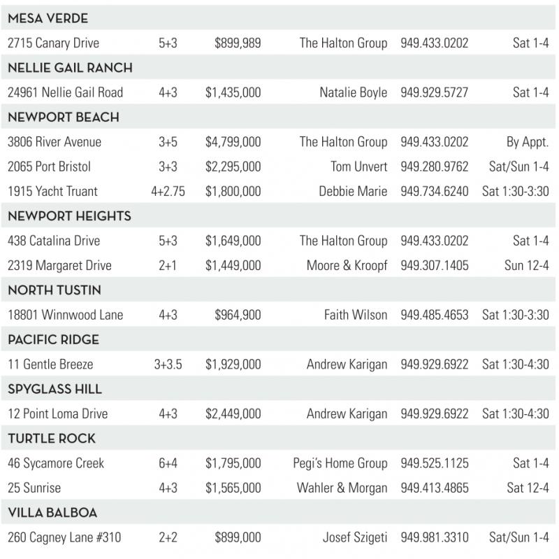 MESAVERDE 2715 Canary Drive 5+3 $899,989 The Halton Group 949.433.0202 Sat 1-4 NELLIE GAIL RANCH 24961 Nellie Gail Road 4+3 $1,435,000 Natalie Boyle 949.929.5727 Sat 1-4 NEWPORTBEACH 3806 River Avenue 3+5 $4,799,000 The Halton Group 949.433.0202 By Appt. 2065 Port Bristol 3+3 $2,295,000 TomUnvert 949.280.9762 Sat/Sun 1-4 1915 Yacht Truant 4+2.75 $1,800,000 Debbie Marie 949.734.6240 Sat 1:30-3:30 NEWPORTHEIGHTS 438 Catalina Drive 5+3 $1,649,000 The Halton Group 949.433.0202 Sat 1-4 2319 Margaret Drive 2+1 $1,449,000 Moore &Kroopf 949.307.1405 Sun 12-4 NORTH TUSTIN 18801 Winnwood Lane 4+3 $964,900 Faith Wilson 949.485.4653 Sat 1:30-3:30 PACIFICRIDGE 11 Gentle Breeze 3+3.5 $1,929,000 Andrew Karigan 949.929.6922 Sat 1:30-4:30 SPYG SS HILL 12 Point Loma Drive 4+3 $2,449,000 Andrew Karigan 949.929.6922 Sat 1:30-4:30 TURTLE ROCK 46 Sycamore Creek 6+4 $1,795,000 Pegi’sHome Group 949.525.1125 Sat 1-4 25 Sunrise 4+3 $1,565,000 Wahler &Morgan 949.413.4865 Sat 12-4 VIL BALBOA 260 Cagney Lane #310 2+2 $899,000 Josef Szigeti 949.981.3310 Sat/Sun 1-4
