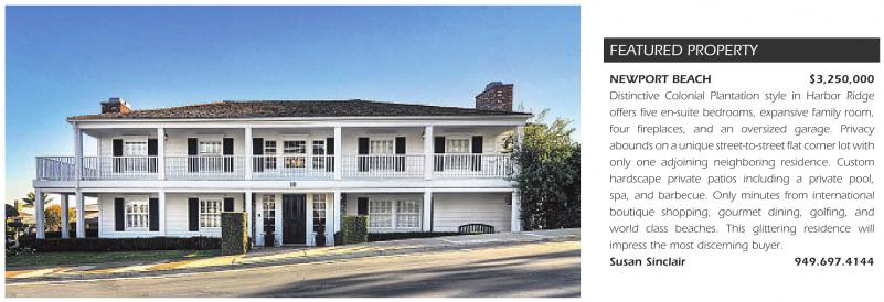FEATURED PROPERTY NEWPORT BEACH $3,250,000 Distinctive Colonial Plantation style in Harbor Ridge offers five en-suite bedrooms, expansive family room, four fireplaces, and an oversized garage. Privacy abounds on aunique street-to-street flat corner lot with only one adjoining neighboring residence. Custom hardscape private patios including a private pool, spa, and barbecue. Only minutes from international boutique shopping, gourmet dining, golfing, and world class beaches. This glittering residence will impress the most discerning buyer. Susan Sinclair 949.697.4144